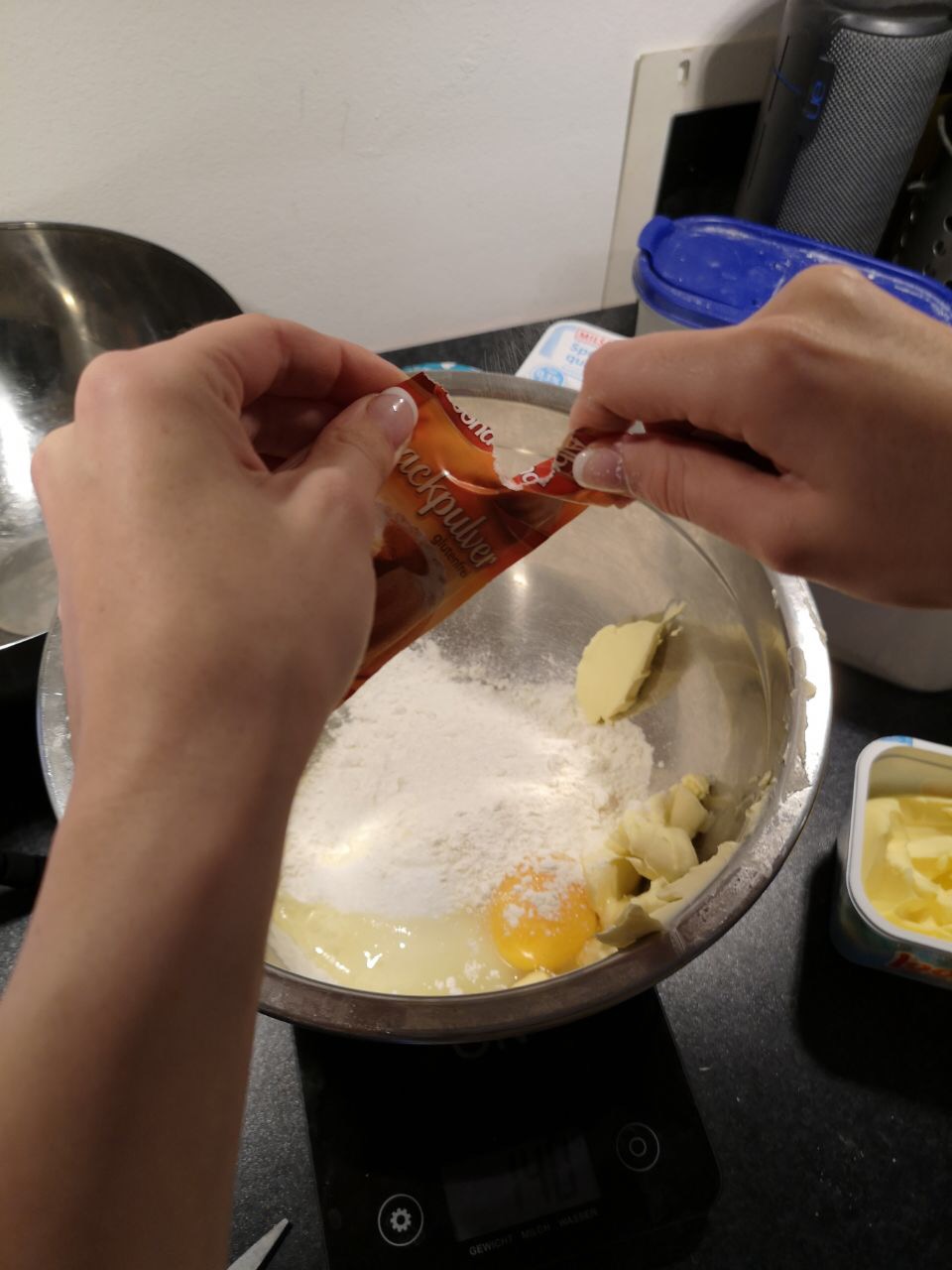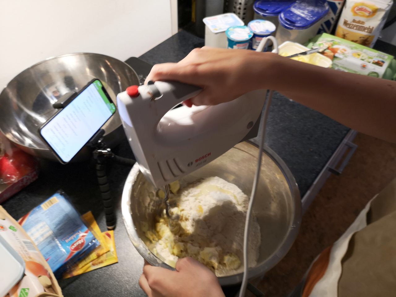 Die Zutaten lagen bereit, die Wage stand auf der Ablage, die Rührschüsseln daneben. Ich rief die Chefkoch-App in meinem Handy auf und legte mit dem Teig los. Zuerst das Mehl, dann der Zucker, Margarine, ein Ei und schließlich Backpulver. Die Zutaten sind einfach, das Einfüllen dieser mit der rechten Hand gestaltete sich allerdings herausfordernder.