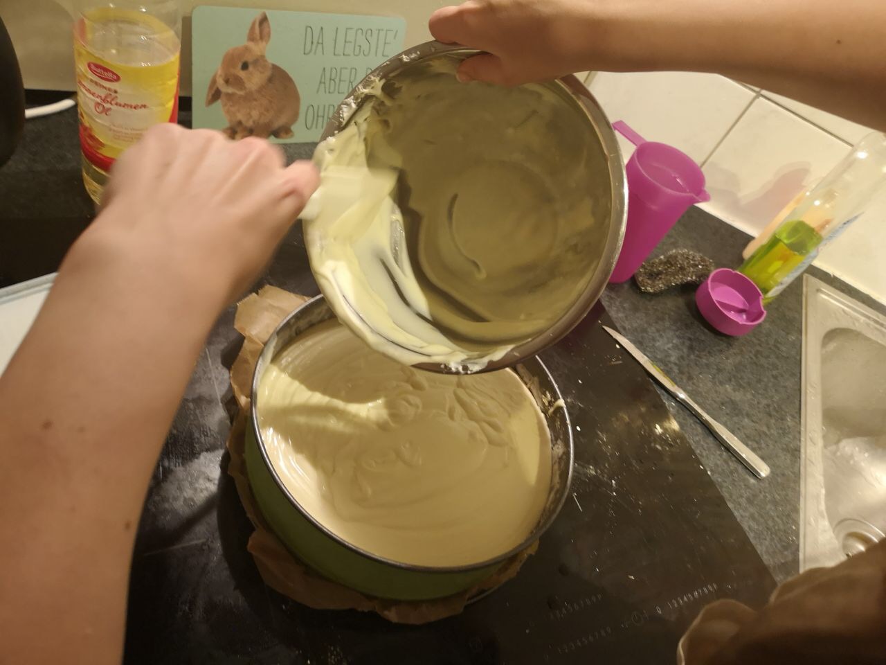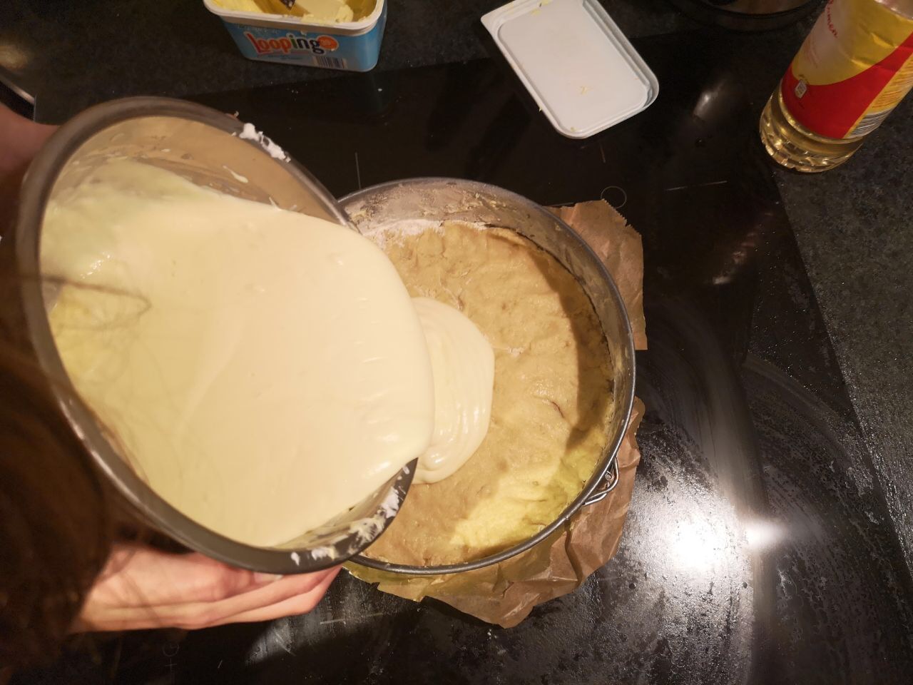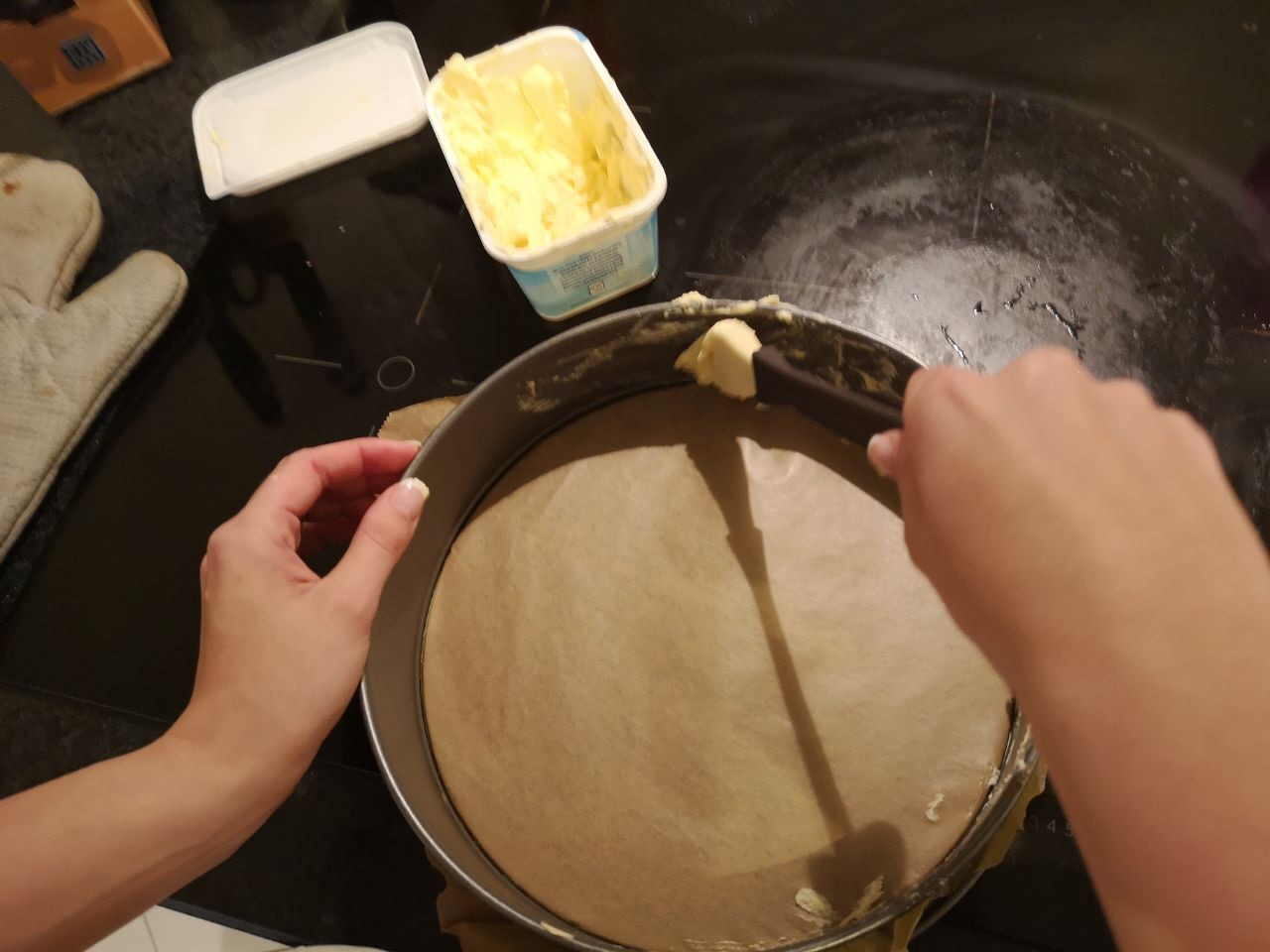 Jetzt war auch die Füllung des Kuchens fertig. Ich musste nur noch den Teig in der Form ausrollen, die Füllung hineinfüllen und den Kuchen in den Ofen schieben. Vorher schmierte ich den Rand der Form mit Butter ein; auch das mit rechts.