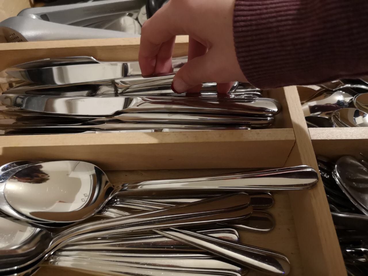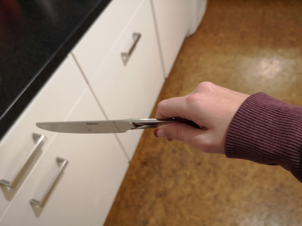 Zwei Finger bleiben am Messer und halten es fest, während meine anderen Finger das Messer kurz loslassen, um dann die Position des Messers so zu verändern, dass ich damit schneiden kann.
